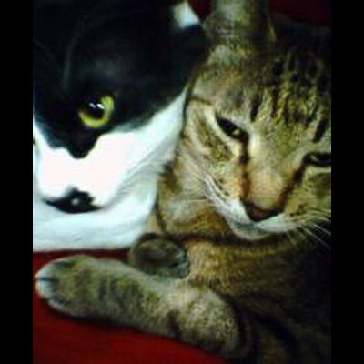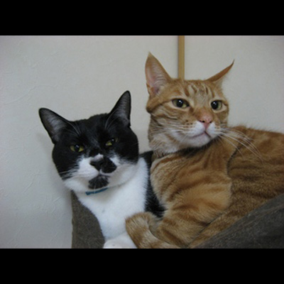 ツナの先住猫、ライナス(白黒)&ラッキー(茶トラ)。得意技は猫団子。ライナスはレバーのドアを押したり、引いたりして開けられます♪