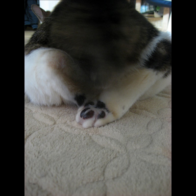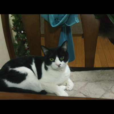テーブルの下で正座していました。今日はおしりから失礼します(笑)近所で首輪付きで保護した猫で、名前はツナです。他にも2匹飼ってます^^