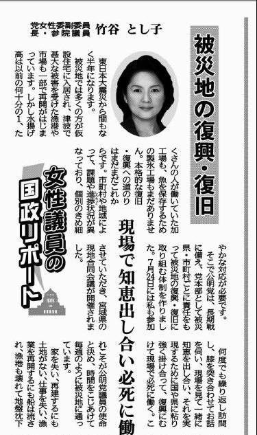 間もなく、東日本大震災から半年を迎えようとしております。東日本大震災からの復興・復旧についての現場での取り組みについて公明新聞のコラム「女性議員の国政レポート」に書かせて頂きました。