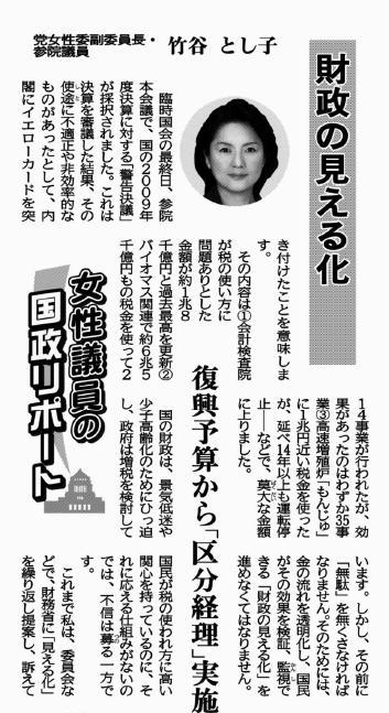 私が公約に掲げた「財政の見える化」の進捗について、公明新聞のコラム「女性議員の国政レポート」に掲載されました。ここでは、復興予算において初めて「区分経理」が行われるようになったことを書かせて頂きました。