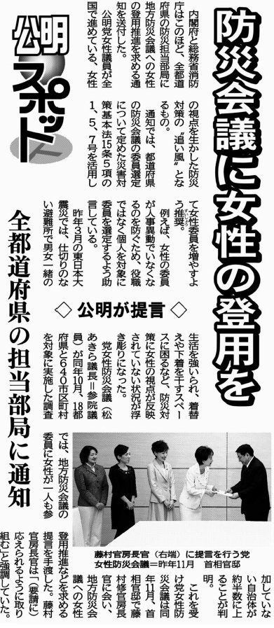 公明党女性防災会議の実態調査で、地方防災会議のメンバーの女性の比率が低いことが分かりました。東日本大震災で、避難所の運営を始め、女性の視点での防災対策の必要性が明らかになりました。そこで、地方防災会議に女性の登用を進めるための申し入れを官房長官に行いました。