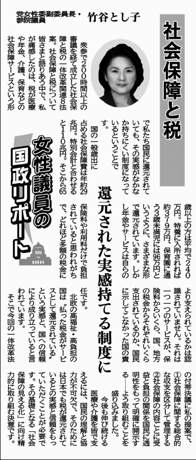 社会保障と税の一体改革について、税や保険料がどのように使われ、国民の皆様に還元されているかについて、公明新聞のコラム「女性議員の国政リポート」に書かせていただきました。