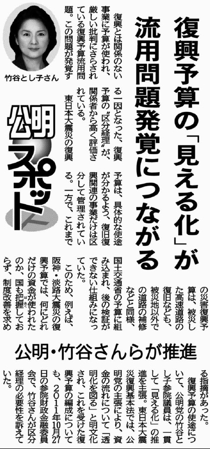 以前もご報告させていただきました、復興予算の「見える化」。これにより復興予算の流用問題が分かるようになったことについて、公明新聞に取り上げられました。