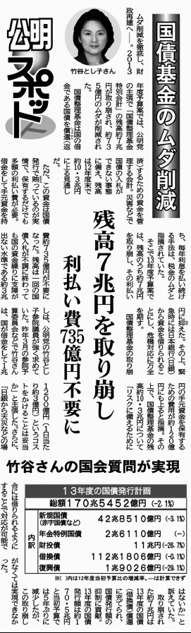 昨年の3月より取り組んできた、国債整理基金の利払い費の削減が、平成25年度予算案で実現することができました。このことについて、公明スポットで取り上げていただきました。