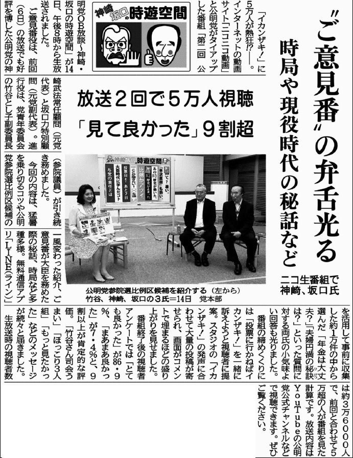 ニコニコ生放送で、神崎元代表、坂口副代表の対談番組、「神崎・坂口の自遊空間」の第2回が放送されました。神崎さんと坂口さんの絶妙なトーク、2回で5万人をこえるニコニコ生放送ユーザにご視聴いただきました。ありがとうございました。動画は公明党公式チャンネルでもご覧頂けます。youtube公明党チャンネル 第2回「神崎・坂口の自遊空間」