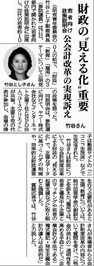 【20代限定】 参議院選挙・政策カンファレンスで、財政、教育、雇用の三分野について公明党の政策を説明させて頂きました。財政については、「財政の見える化」で世代間公平化として、財政の見える化が世代間の公平性を担保するための前提条件と訴えさせて頂きました。この模様は、Youtube、ニコニコ動画、Ustreamで生中継されました。