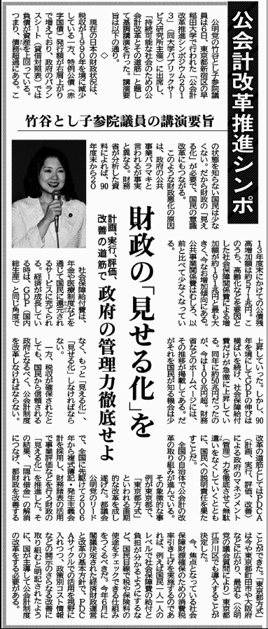 8月6日、早稲田大学で行われました、「公会計改革推進シンポジウム2013」で、講演させて頂きました。その要旨が公明新聞に掲載されました。なお、公明党ホームページにも同じ記事が掲載されています。