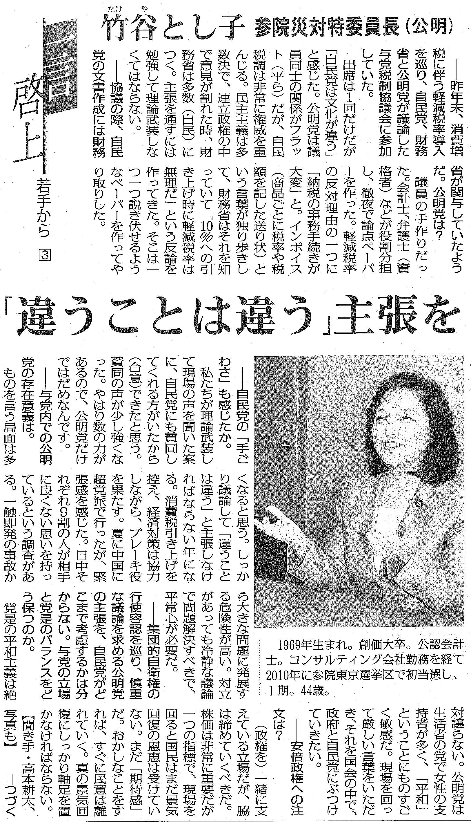 1月9日付けの毎日新聞 朝刊5面に 一筆啓上 若手からという連載記事に私のインタビュー記事が掲載されました。昨年末の与党税制協議会での、消費税軽減税率導入に向けた交渉過程で感じたことについてお話させて頂きました。