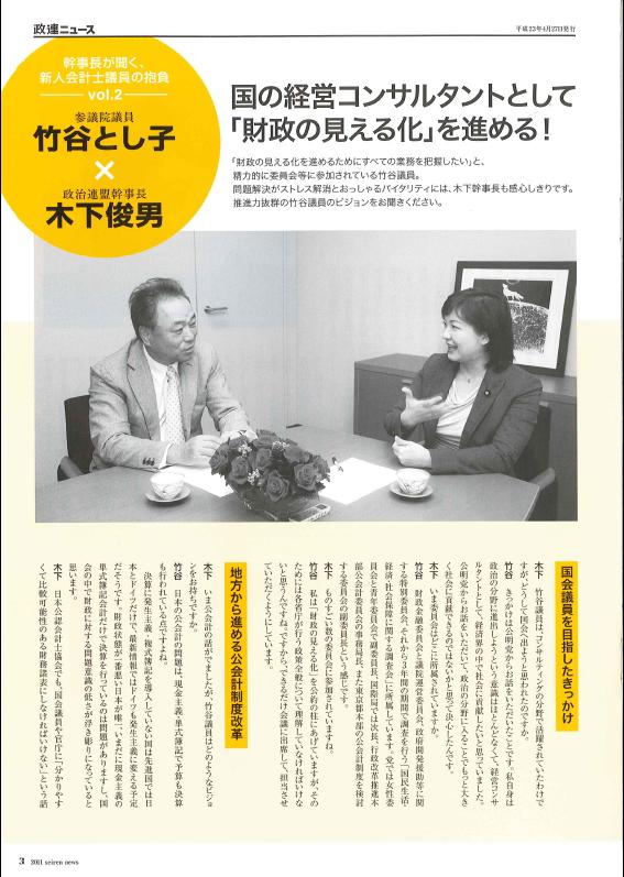 日本公認会計士協会政治連盟のCPA政連ニュースに木下俊男政治連盟幹事長との対談記事を掲載していただきました。インタビューでは、国会議員を目指したきっかけ、公会計制度改革、公認会計士法の改正などについて対談させていただきました。CPAの皆様にご覧いただければ幸いです。