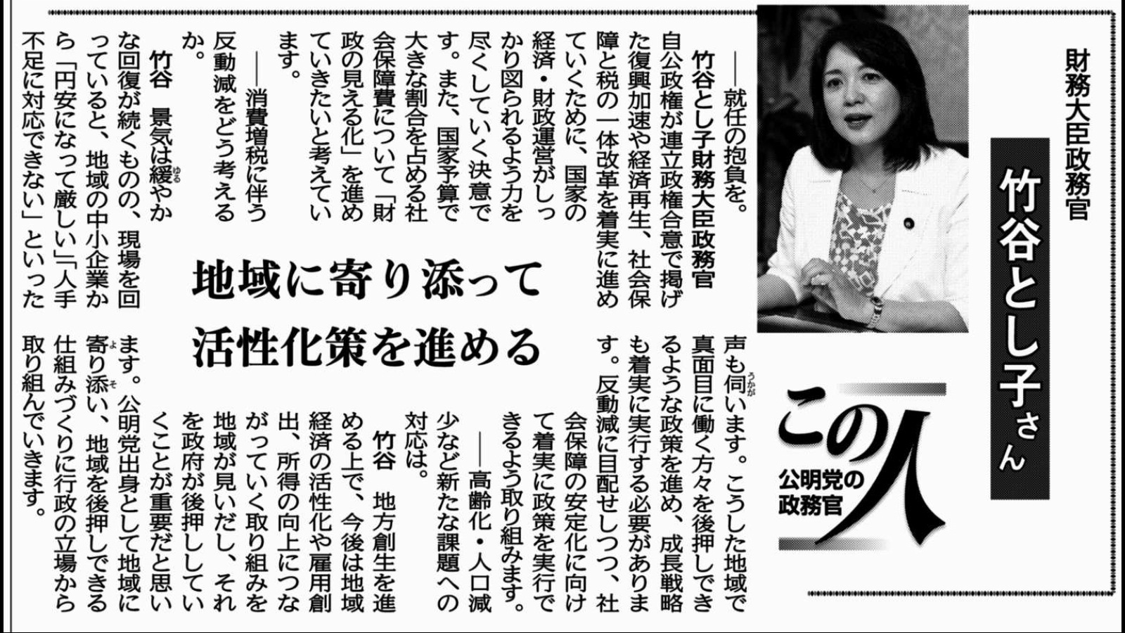 公明党のフォーラムが5月から6月にかけて各地で盛大に開催され、竹谷とし子党女性局次長が山口那津男代表らとともに、必勝への決意を語りました。また、各界の識者が来賓として訪れ、竹谷さんへの期待の言葉を述べました。・・・