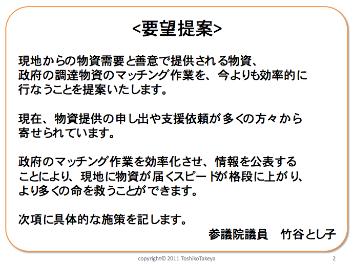 そのため提案書を、公明党 東北地方太平洋沖地震対策本部(本部長 井上義久幹事長)を通じて、政府に申し入れをさせていただきましたので、ご報告させていただきます。