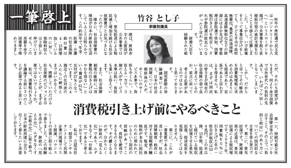 納税通信の11月15日号のコラム「一筆啓上」に「消費税引き上げの前にやるべきこと」と題して寄稿させていただきました。 この中で、消費税引き上げの前に必要なこととして、1.社会保障全体のビジョンを示すこと、2.景気回復、3.政府に対する信頼感の醸成、その意味での「財政の見える化」が必要、と主張させていただきました。