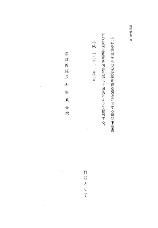 子ども手当からの学校給食費の差引についての政府の検討状況を質す質問主意書を提出し、政府から現在の検討中であるとの答弁書が届きましたので、掲載させていただきます。